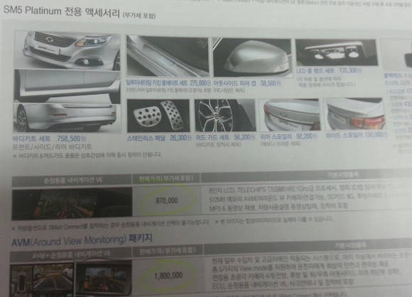 회사측의 설명대로 르노삼성자동차의 '종합가격표'를 살펴보면, 어라운드뷰 모니터링 패키지는 순정용품 네비게이션 V6에 전장용 초광각 카메라 4개와 샤크안테나 등으로 구성된 SM5 플래티넘 전용 '액서서리'로 표기돼 있다.