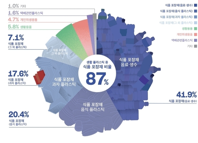 조사에 따르면 학생들이 가장 많이 접하는 플라스틱은 식품 포장재(87%)였으며, 이 중에서도 생수 및 음료 플라스틱 용기가 전체의 41.9%를 차지해 가장 심각한 비중을 보였다. 사실상 “10개 중 4개가 음료·생수 페트병”인 셈이다.