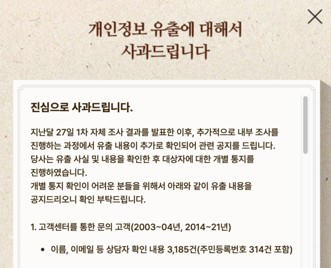 추가로 확인된 유출 내역에 따르면, 2003~2004년 및 2014~2021년 고객센터 문의 고객 3185건의 이름과 이메일 등 상담자 확인 정보가 유출됐으며, 이 가운데 314건에는 주민등록번호가 포함된 것으로 확인됐다. 2003~2006년 온라인 입사 지원자 2022건의 경우 이름, 이메일, 종교 등 입사지원서 기재 정보가 포함됐고, 이 중 990건에는 주민등록번호가 포함됐다. 2011년 잡페어 부스 방문자 966건은 이름, 이메일, 휴대전화번호 등이 포함됐으나 해당 정보는 모두 암호화된 상태였다. 또한 2001~2005년 및 2011~2021년 B2B 사업 제안 담당자 1875건의 이름, 이메일, 휴대전화번호 등도 유출된 것으로 파악됐다.