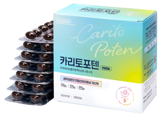 동국제약에 따르면, 카리토포텐은 독일에서 개발된 생약성분의 전립선비대증 배뇨장애 개선제다. 특히, 대규모·장기간 임상연구와 유럽 내 사용 경험을 통해 입증된 우수한 효과와 안전성을 기반으로 약국 판매 1위라는 성과를 달성할 수 있었다. 주성분인 쿠쿠르비트종자유엑스(서양호박씨오일 추출물)는 불포화지방산과 피토스테롤 등 다양한 약리 활성 성분을 함유하고 있으며, 유럽에서는 전통적으로 요로 문제와 비뇨기 질환 관리에 활용돼 왔다.