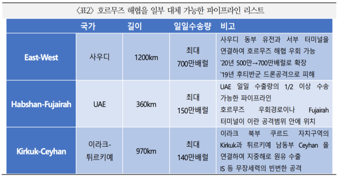 사우디아라비아와 UAE가 육상 파이프라인을 통해 물량 우회를 시도하고 있으나, 하루 약 260만 배럴 수준에 불과해 해협 전체 수송량을 감당하기엔 턱없이 부족하다. 특히 사우디의 'East-West' 파이프라인과 UAE의 'Habshan-Fujairah' 터미널은 각각 이란의 미사일 및 드론 공격 가시권에 있어 안전을 담보하기 어려운 상황이다.