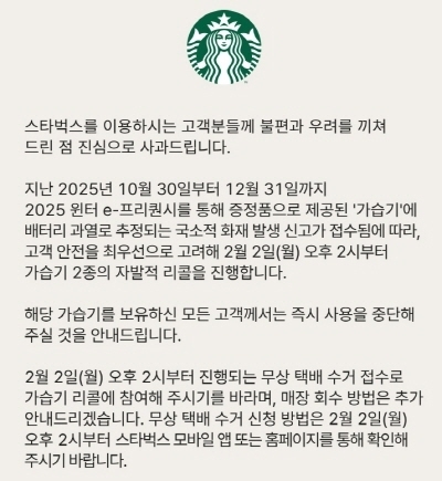 스타벅스는 해당 가습기를 보유한 고객이 제품을 반납하면 스타벅스 모바일 카드 3만원권을 제공할 방침이다.
