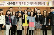 [KJtimes=서민규 기자]“함께 꾸는 꿈의 기적을 믿는 KB, 당신의 꿈을 응원합니다.”KB금융그룹은 8일, 오전 여의도 본점에서 ‘KB금융 피겨 유망주 장학금’ 전달식 행사를 진행했다. 이 자리에는 윤종규 KB금융그룹 회장과 이기인 대한빙상경기연맹 부회장, ‘피겨 여왕’ 김연아가 참석했다. 아울러 장학 프로그램의 대상자로 선발된 국내 피겨 스케이팅 유망주들이 자리를 함께 했다. KB금융그룹에 따르면 대한빙상경기연맹은 중학교 3학년 이하에서 국내랭킹 순으로 장학 프로그램 대상 선수를 선발했다. 이날 자리는 선발된 남녀 싱글 10명(남2, 여8)의 선수들에게 훈련 지원을 위한 장학금을 전달하고 피겨 꿈나무들을 응원하기 위해 마련됐다. 앞서 지난 1월 ‘KB금융 코리아 피겨스케이팅 챔피언십 2015’에서 KB금융그룹은 김연아와 함께 대한빙상경기연맹에 피겨 유망주들