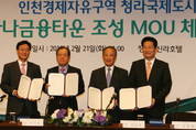 하나금융그룹의 하나금융타운 조성이 속도를 낼 전망이다. 하나금융은 이를 위해 인천시와 MOU를 체결했다. 21일 하나금융에 따르면 이날 오전 11시 신라호텔에서 김승유 하나금융그룹 회장, 이지송 한국토지주택공사 사장, 송영길 인천광역시장, 이종철 인천경제자유구역청장이 참석한 가운데 ‘인천 청라 경제자유구역 (가칭)하나금융타운 조성 MOU 체결식’을 가졌다. 이날 투자협약을 통해 하나금융그룹은 인천 청라경제자유구역에 약 10만평 규모의 하나금융타운을 건립하기로 하고 이를 위해 향후 인천시, LH공사와 구체적인 사업계획을 협의해 나갈 예정이다. 하나금융타운은 하나금융그룹이 글로벌 경쟁력 강화를 위해 지속적으로 추진해 온 프로젝특이다. 하나금융그룹의 글로벌 커뮤니케이션 허브로써 헤드쿼터, 금융RD센터, 금융전문 인재육성을 위한 교육연