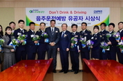 [kjtimes=정소영 기자] 오비맥주(대표 김도훈)는 18일 도로교통공단(이사장 신용선)과 함께 음주운전 폐해 줄이기에 앞장서고 있는 경찰관들을 격려하기 위해 ‘제1회 음주운전 예방 유공자 시상식’을 개최했다고 밝혔다. 오비맥주는 이날 강원도 원주시 도로교통공단 본부에서 김도훈 오비맥주 대표와 신용선 도로교통공단 이사장, 공단 관계자 등이 참석한 가운데 전국에서 음주운전 예방에 기여한 단속 경찰관과 관계 기관 공무원 15명을 선정해 시상했다.이날 시상식에서는 지속적인 음주단속으로 음주운전 사망사고 줄이기에 가장 크게 기여한 부산 동래경찰서 이길훈 순경과 음주운전 예방 교재개발과 상습음주자 상담을 맡은 도로교통공단 정금숙 과장 등 15명이 도로교통공단 이사장 표창을 수상했다.음주운전 단속은 주로 야간에 이뤄지는 데다, 검문에 불응하거나 도주하는 운전자의 차에 치여 단속 경찰관이 부상을 입는 등 2차 사고가 끊이지 않을 만큼 안전사고의 위험에 노출된 업무로 알려져 있다.김도훈 대표는 “주류업계 선도기업으로서 도로 위에서 위험을 감수하고 음주운전 예방을 위해 앞장서는 음주운전 단속 경찰관들을 격려하고 음주운전 위험에 대한 경각심을 높이기 위해 이번 시상식을 마