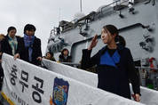 [KJtimes=이지훈 기자]최태원 SK그룹 회장의 차녀인 최민정(23) 해군 중위가 6개월간의 소말리아 아덴만 파병 임무를 마치고 돌아왔다. 해군은 23일 오전 10시 30분 부산 남구 해군작전사령부 강당에서 최 중위가 소속된 청해부대 19진 입항 환영식을 열었다. 최 중위를 포함한 청해부대 19진 장병 300여 명은 4천400t급 구축함인 충무공이순신함을 타고 지난 6월 23일 아덴만 해역으로 떠나 6개월 동안 파병 임무를 수행했다. 청해부대 19진 장병들은 중동호흡기증후군(메르스) 탓에 출항 당일 가족들이 참석하는 환송식도 못 하고 떠났다 최 중위는 입항 환영식이 진행되는 동안 강당 앞에서 10번째 줄 가운데에 배정된 간부 좌석에 앉아 절도 있는 해군 장교의 모습을 보였다. 20여 분만에 환영식이 끝나고 어머니인 노소영 아트센터 나비 관장이 들어오자 최 중위는 활짝 웃었다. 어머