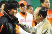 [kjtimes=キム・ボムネ記者] ハンファのキム・スンヨン会長が16日午後、ソウル蚕室野球場で開かれた2012プロ野球ハンファ対斗山の試合を観戦した。キム会長は同日、7000人余りの系列会社の従業員と一緒に韓選手団を探して挨拶を渡して激励金を手渡した。試合半ば頃スタジアムに到着したキム会長は、ジャンパと綿地の快適な履きで競技を観覧した。6-4でハンファが勝利、景気が終わると、キム会長は、グラウンドに降りて選手たちを直接会った。特にパク・チャンホ選手を別々に呼んで、 "優勝させてくれることができるか"と激励を伝えた。この席でキム会長は、選手たちに"命をかけるという覚悟でプロらしく試合に臨もう。最善を尽くさなければ優勝することができる"と話した。キム会長は、ハン・デファ ハンファ・イーグルス監督に準備した金一封の封筒を渡した後、グラウンドを出た。