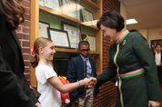 [KJtimes=김봄내 기자]미국을 방문 중인 김정숙 여사는 11일 워싱턴 DC 소재 키(Key)초등학교를 찾아 민화수업을 함께 하고, 케이 팝 수업을 관람했다. 키초등학교의 한국문화 체험 프로그램은 워싱턴 DC 교육청이 1974년부터 주관하고 있는 ‘대사관 자매결연 사업’에 따라 워싱턴 DC 소재 초.중등학교와 대사관이 1대1로 짝을 이뤄 한 학기 동안 해당 국가의 문화를 집중적으로 배우는 프로그램이다. 김 여사가 민화교실에 입장하자 학생들은 “안녕하세요?”라며 한국어로 인사를 건넸다. 이에 김 여사는 “Hello everyone? How are you?”라고 영어로 인사했다. 김 여사는 “오늘 아침에 여러분이 한국의 folk art 민화를 공부한다는 얘기 듣고 마음이 즐거웠다”며 “어서 빨리 가서 만나야 할 것 같아서 아침에 일찍 왔다”고 전했다. 민화수업을 마친 김 여사는 이어 케이팝 체험 수업을 참관하고 언어의 장벽을 넘어 각 나라 청소년들이 좋은 문화를 나누는 모습을 격려니다. 케이팝 댄스교실을 방문한 김정숙 여사에게 학생들의 질문이 이어지기도 했다. “춤추신 적 있나요?”라는 학생들의 질문에 김 여사는 “여러분 나이 때요. 지금도 춤을 추