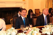 [kjtimes=견재수 기자] 문재인 대통령이 도널드 트럼프 미국대통령과 취임 후 첫 회동을 가졌다. 더불어민주당 추미애 대표는이틀 전 "문 대통령이 국민과 국익을 위해 정상회담에 집중할 수 있도록 국회의 초당적 협력을 정중히 부탁한다"고 강조했다. 문 대통령은 29일 오후 6시(현지시간) 미국 워싱턴DC에 위치한 백악관에 도착해 트럼프 대통령과 밝은 표정으로 악수를 나누며 30분 후부터 진행된 공식 환영 만찬에 참석했다. 두 정상의 첫 악수는 약 4초간 이뤄졌으며, 퍼스트레이디인 김정숙 여사와 멜라니아 여사도 악수와 친근한 포즈를 취했다. 밝은 분위기로 시작된 양국 정상의 만남은 백악관 만찬장으로 이어졌다. 트럼프 대통령은 만찬 직전 “나는 문 대통령이 북한, 무역, 기타 복잡한 사안에 대해 우리 국민과 토론했다는 것을 알고 있다”며 “우리는 그것에 대해 논의할 것이고, 시간이 늦어질 수 있다”고 말했다. 트럼프 대통령 내외는 백악관 환영만찬의 주메뉴로 ‘화합과 협력’을 상징하는 비빔밥을 선택했다. 비빔밥은 외국 정상이 방한했을 때 오찬과 만찬에 단골로 선보이는 메뉴다. 백악관 만찬 행사는 당초 1시간 30분으로 예정돼 있었지만 35분 더 늘어난