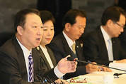 [kjtimes=견재수 기자] 박용만 대한상의 회장과 현정은 현대그룹 회장, 정용진 신세계그룹 부회장, 정몽윤 현대해상 회장 등이 한 곳에 모였다. 이들은 김무성 새누리당 대표 등 여당의원 10여명과 정책간담회를 통해 법인세율 인상에 신중해야 한다는 의견을 전달했다. 16일 남대문 대한상공회의소 회관에는 박용만 회장 등 상의 회장단 25명과 여당의원들이 한자리에 모였다. 경제계는 이 자리에서 일명 ‘원샷법’으로 불리는 사업재편지원특별법의 조속한 재정과 한중 FTA의 신속한 비준을 정계에 요청했다. 간담회에서 대한상의 측은 사실상 법인세율 인상에 대한 목소리에 반대 의견을 전달했다. 상의 관계자는 "정부가 각종 법인세 감면제도를 대폭 축소했고 기업소득환류세제도 새로 시행되는 만큼 실질적 법인세 부담은 계속 늘어나고 있다"며 "불요불급한 지출예산