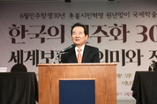 [kjtimes=견재수 기자] 정세균 국회의장이 7일 오전 세종문화회관에서 열린 ‘한국의 민주화 30년: 세계 보편적 의미와 전망’ 국제학술대회에 참석했다. 정 의장은 "올해는 모든 계층이 참여해 군사 독재정치 종식을 이룬 ‘6월 민주항쟁’이 30주년을 맞는 해“라면서 "6월 민주항쟁은 한국 현대사에 절차적 민주주의가 뿌리 내리는 결정적 계기를 마련했다”라고 말했다. 이어 “6월 민주항쟁 정신은 지낸 해 촛불 시민혁명으로 이어졌다”면서 "무너진 헌정질서 회복을 위해 6개월 동안 1700만명에 달하는 시민들이 평화롭게 촛불을 밝혔다"고 말했다. 또 "오늘 국제학술대회에서 촛불 시민혁명 이후 한국 민주주의의 지향 방향에 대해 다양하고 심도 있는 논의가 펼쳐지길 바란다"고 덧붙였다. 이날 열린 국제학술대회는 ‘6월민주항쟁30년사업추진위원회’와 서울특별시 주최로 11월 7일과 8일 이틀 간 열리며, 국내외 석학들이 6월 민주항쟁과 촛불혁명의 세계 속에서의 의미 및 전망에 대해 논의한다.