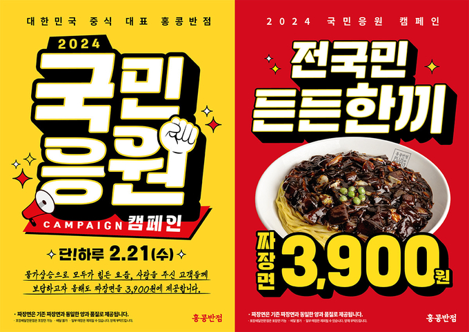 [KJtimes=김봄내 기자] 더본코리아의 짬뽕·짜장면 전문점 홍콩반점0410(대표 백종원, 이하 홍콩반점)이 오랜 기간 사랑받아 온 브랜드로서 고객 성원에 보답하고자 오는 21일(수) 짜장면을 3,900원에 제공하는 ‘국민응원 캠페인’을 진행한다.
