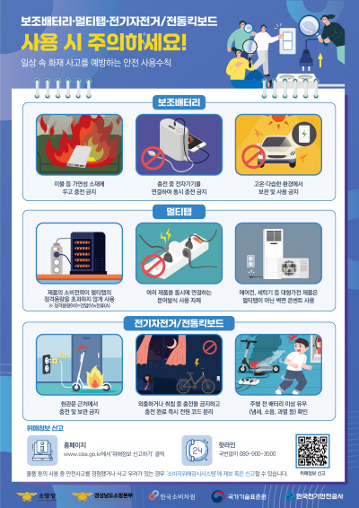 또한 각 참여 기관은 보조배터리·멀티탭·전기자전거·전동킥보드 화재사고 예방 홍보 포스터를 제작해 각 기관의 온라인 채널을 통해 홍보하고, 공동주택 관리사무소 등의 협조를 받아 배포할 계획이다.