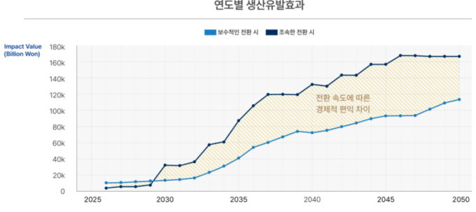 반면 전환 시점을 늦출 경우, 우리 경제는 25년간 약 1909조원의 생산 기회와 72만명의 고용 기회를 스스로 포기하는 셈이 된다.