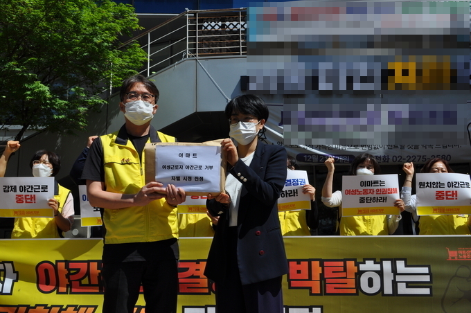 이어 “이마트 여사원들은 명백한 야간근로 거부 의사를 사측에 전달하고 있음에도 모성보호를 위해 제정된 가장 기본적이고 최소한의 근로 기준인 야간근로 결정권을 사측으로부터 박탈당하고 있다”며 “특히 이러한 거부 의사전달을 했다는 이유로 차별적 겁박 면담이 자행되고 있다”고 말했다.