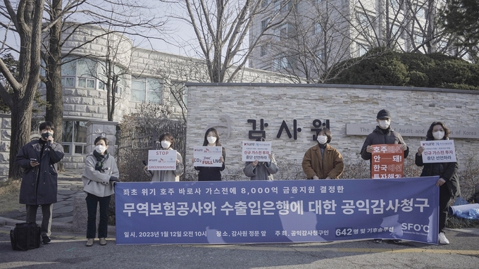 기후솔루션은 두 공적 금융기관을 대상으로 지난 12일 오전 감사원에 공익감사를 청구하고 감사원 정문에서 기자회견을 열었다. 공익감사청구에는 시민 642명이 연명해 참여했다.