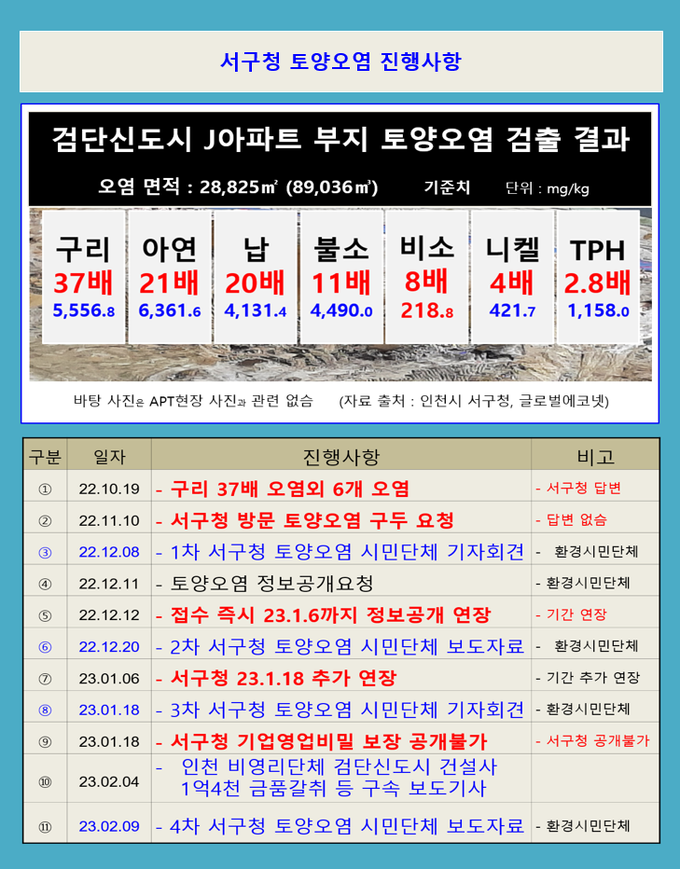 이들 단체는 "1차로 2022년 10월 19일 국민신문고로 정보공개를 요청했고, 2022년 11월 11일 서구청을 방문해 서구청이 '토양오염 정화 명령 기간 동안 정화현장을 한 번도 현장확인을 하지 않았다'고 답변했다"며 "토양오염 정화에 대한 사항을 구두 요청했지만, 답변이 없자 2022년 12월 8일 인천시청에서 기자회견을 개최했다"고 전했다.