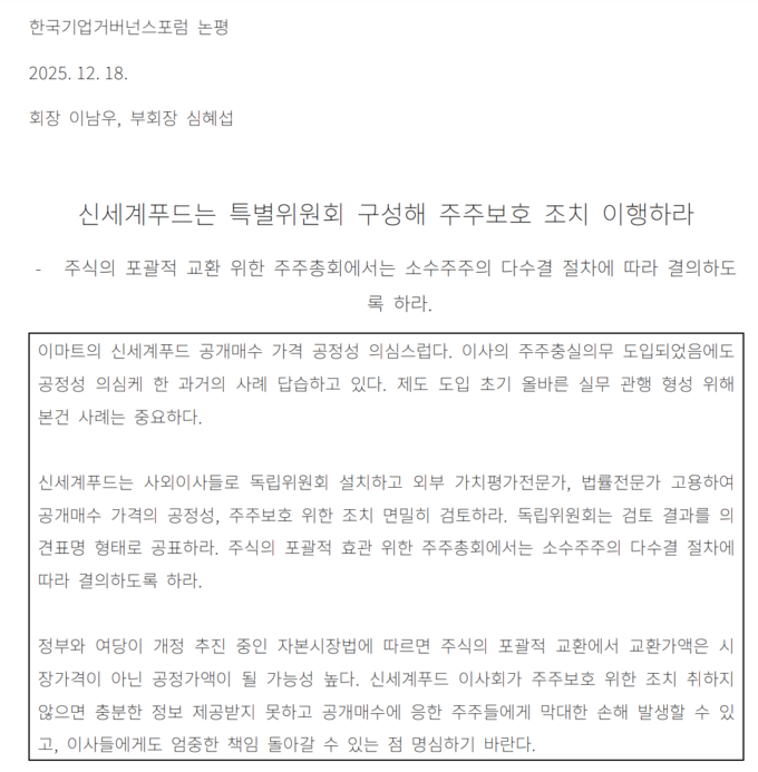 한국기업거버넌스포럼(회장 이남우)은 지난 18일 논평을 통해 "신세계푸드는 사외이사 중심의 특별위원회를 구성하고, 주주총회 시 소수주주 다수결(MoM, Majority of Minority) 절차를 도입해 주주 권익을 보호하라"고 요구했다.