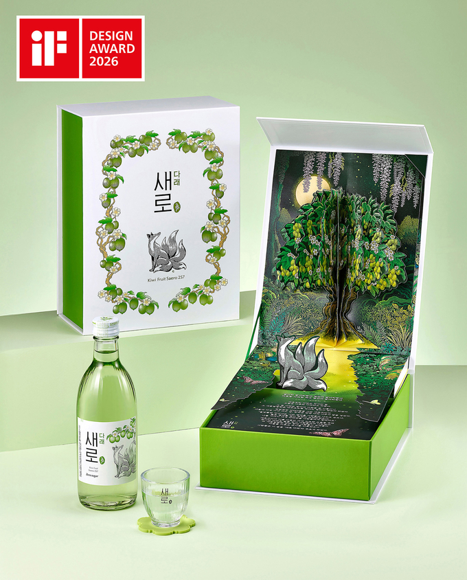 ‘새로 다래’는 한국 설화 속 구미호를 현대적으로 재해석한 제로 슈거 소주로, 병 라벨과 선물용 패키지에 구미호가 다래 향을 맡는 순간을 시각화했다. 스토리텔링을 기반으로 전통적 서사와 팝업 구조의 인터랙티브 패키징을 활용해 소비자의 체험 경험을 확장했다.