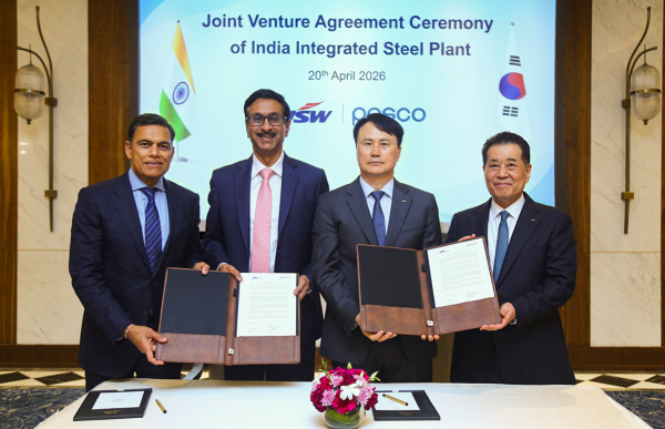포스코는 20일(현지시간) 인도 현지에서 인도 1위 철강사 JSW스틸과 일관제철소 건설을 위한 합작투자계약(JVA)을 체결했다. 이번 협력은 양사의 강력한 파트너십을 바탕으로 인도 내 고수익 시장을 공략하고 글로벌 철강 공급망을 한층 강화하기 위한 행보다.