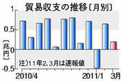 日本財務省が20日発表した3月の貿易黒字(速報、通関ベース)は、前年同月比78.9%減の1965億円だった。2カ月連続の黒字だったが、東日本大震災の発生で輸出額が16カ月ぶりに減少したことが響いた。特に3月中下旬(11~31日)は前年同月比9.7%と影響が大きかった。日本経済新聞が同日、報じた。 輸出額は2.2%減の5兆8600億円。品目別では、サプライチェーン(供給体制)の被害による部品調達の停滞と東京電力の計画停電で減産に追い込まれた自動車が27.8%減と大きく減少した。地域別でみても全ての地域で自動車の減少が響いた。このほか、半導体の輸出額も6.9%減と大きく落ち込んだ。一方、輸入額は11.9%増の5兆6695億円。原油など資源価格の上昇に加え、前年に春節(旧正月)の影響で落ち込んでいた中国からの輸入が25.0%増の1兆2758億円と大きく伸びた。 震災の影響は、輸出入とも中下旬にかけて顕著に表れている。3月上旬(1~10日)の輸出額は前年同月比14.8%増加していたが、中旬(11~20日)では5.9%の減少に転じた。特に下旬(21~31日)は13.1%減と影響の広がりがみられる。輸入額は上旬16.3%増に対し、中下旬は9.5%増と伸びが鈍化した。 한국어 일본의 3월 수출액이 강진과 쓰나미(지진해일) 여파로 16개월 만에 처음 감소세를 기록했다. 20일 일본 재
