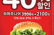 [kjtimes=장진우 기자] 버거킹(대표 문영주)은 26일 연말을 맞아 이날부터 오는 29일까지 나흘간 와퍼주니어 단품을 기존 3500원에서 40% 할인된 2100원에 판매한다고 밝혔다.행사 기간 오전 10시부터 오후 10시까지 진행되는 이번 프로모션은 연말 송년회나 선물 구입 등의 잦은 지출로 지갑이 얇아진 고객들을 위해 버거킹이 준비한 깜짝 이벤트로 많은 고객들에게 만족감을 선사할 예정이다.버거킹 마케팅팀 관계자는 "올 한해 버거킹에 대한 고객들의 큰 사랑에 감사의 뜻을 전하기 위해 이번 프로모션을 준비했다"며 "지출이 많은 요즘 버거킹이 준비한 선물로 기분 좋은 연말이 되시길 바라며 앞으로도 항상 고객을 생각하는 버거킹이 되겠다"고 말했다. 이번 할일행사는 버거킹 전국 매장에서 진행된다. 단 잠실/문학야구장점, 대명비발디점, 오션월드점, 용평리조트점, 여주
