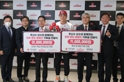 [KJtimes=김승훈 기자] SSG랜더스(대표이사 민경삼, 이하 SSG)의 추신수 선수가 22시즌 동안 '희망 랜딩'캠페인을 통해 적립한 기부금 총 1억 200만원을 취약계층 군인들과 인천시 학교 밖 청소년들에게 전달했다. 추신수 선수는 지난 5월1일, 인천SSG랜더스필드에서 진행된 협약식을 통해 '희망 랜딩'캠페인의 시작을 알린 바 있다. '희망 랜딩'은 추신수 선수의 22시즌 볼넷, 홈런, 도루 기록을 100만 원으로 환산한 기부금을 적립하여 취약계층 사회 초년생들이 사회 구성원으로서 자립할 수 있도록 지원하는 캠페인이다. 이번 시즌 추신수 선수는 16홈런, 15도루, 71볼넷이라는 기록으로 총 1억 200만원의 기부금을 적립했으며 이 중 3100만원을 인천시 학교 밖 청소년들의 교육비로, 그리고 7100만원을 취약계층 군인 사병들의 생계비로 전달했다. 기부금 전달식은 지난 21일인천SSG랜더스필드에서 진행되어 추신수 선수와 조상범 인천사회복지공동모금 회장, 권오성 대한민국육군협회 회장, 라현준 연수구학교밖청소년지원센터 소장이 참석했다. 추신수 선수는 "이번 시즌 경기를 치르면서 받았던 사랑을 기록을 통해 되돌려 줄 수 있어 영광이다. 우리나라의
