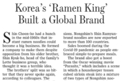[KJtimes=김봄내 기자]미국 유력 경제신문 월스트리트저널(The Wall Street Journal) 이 故 신춘호 농심 회장의 별세와 관련해 신라면을 글로벌 브랜드로 키운 업적을 높이 평가했다. 월스트리트저널은 지난 17 일자 신문에 ‘ 한국의 라면왕, 글로벌 브랜드 만들다(Korea`s ‘Ramen King’ Built a Global Brand)’ 라는 제목의 기사를 게재하며, 신 회장이 주변의 만류에도 불구하고 한국의 매운맛을 고집하며 세계 무대로 나갔기 때문에 농심이 100 여개 국에 수출하는 글로벌 식품기업으로 성장할 수 있었다고 분석했다. 특히, 최근에는 코로나19 의 확산과 함께 간편식을 찾는 트렌드가 세계적으로 번지며 판매가 크게 늘었다고 밝혔다. 또한, 영화 기생충의 오스카상 수상과 함께 영화에 등장한 짜파구리가 전 세계적으로 알려지게 되었고, 이에 농심이 컵라면 버전의 짜파구리를 실제 제품으로 선보이기도 했다고 소개했다. 농심 관계자는 “ 월스트리트저널이 故 신춘호 회장님의 소식을 다룬 것은 농심이 글로벌 시장에서 큰 관심을 받고 있다는 의미” 라며 “ 라면으로 세계 1 등을 해보자는 회장님의 꿈을 이루기 위해 해외사업 확대에