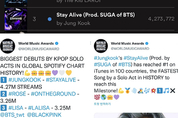 [KJtimes=김봄내 기자]그룹 방탄소년단(BTS) 멤버 정국의 'Stay Alive(스테이 얼라이브)'가 글로벌 음원 플랫폼에서 '최고', '최단' 기록을 싹쓸이하며 화려한 시작을 알렸다. 지난 11일 방탄소년단의 슈가가 프로듀싱하고 정국이 부른 웹툰·웹소설 '세븐 페이츠 : 착호'(7FATES: CHAKHO)의 오리지널 사운드트랙(OST) 'Stay Alive'가 발매됐다. 'Stay Alive'는 세계 최대 글로벌 음원 사이트 'Spotify(스포티파이)‘에서 눈부신 활약을 펼치고 있다. 유럽의 빌보드로 불리는 월드뮤직어워드(WMA)에 따르면, 정국의 'Stay Alive'는 스포티파이의 글로벌 차트에 427만 스트리밍을 나타내며 역대 K팝 솔로 가수 최고 순위로 데뷔했다고 전했다. 정국의 'Stay Alive'는 지난 12일 스포티파이 글로벌 차트 3위에 랭크되며 역대 한국 솔로곡 중 가장 높은 순위로 데뷔했다. 'Stay Alive'는 총 스트리밍량 4,273,772으로 2위에 오른 저스틴 비버 X 더 키드 라로이의 'STAY(스테이)'와 약 7000이라는 근소한 차를 보이며 3위를 기록했다. 이는 스포티파이에서 한국 아티스트의 역대 모든 곡을 통