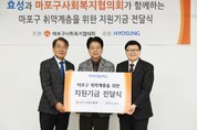 [KJtimes=김봄내 기자]효성이 11일 마포지역 저소득층 지원을 위해 마포구사회복지협의회에 지원금 3천만원을 전달했다. 이날 전달한 지원금은 마포구 저소득층의 생활안정을 위한 생계비, 의료비, 교육비 등 긴급구호비로 사용된다. 효성은 지난 2013년부터 지원을 이어왔다. 이날 전달식에는 노웅래 의원(마포구갑), 박인길 마포구사회복지협의회장, 최영범 효성 커뮤니케이션실장(부사장) 등이 참석했다. 한편, 효성은 지난 5일 마포구청 광장에서 열린 ‘2020 따뜻한 겨울나기 희망나눔 페스티벌’에 후원금 4천만원과 ‘사랑의 김장 김치’를 전달하는 등 본사 소재지인 마포구 지역사회에 대한 나눔을 이어가고 있다.