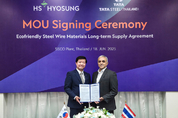 [KJtimes=김봄내 기자]HS효성첨단소재가 18일(현지시각) 태국 타타스틸(TATA STEEL)과 친환경 스틸 원재료 장기구매를 위한 양해각서(MOU)를 체결했다. 이번 MOU를 통해 HS효성첨단소재는 타이어 스틸코드에 사용되는 친환경 스틸 원재료를 안정적으로 공급받을 수 있게 되었다. 인도 대표 기업인 타타 그룹 산하의 태국 타타스틸은 전기로 방식으로 고품질 스틸 원재료를 생산하고 있다. 전기로 방식으로 생산된 제품은 고철 스크랩을 재활용하고 에너지 효율성이 높아, 기존 고로 방식으로 생산된 제품 대비 탄소배출량이 약 60% 낮다. HS효성첨단소재는 해당 제품을 원재료로 사용하면 기존 대비 탄소배출량이 적은 친환경 타이어 스틸코드를 생산하고 공급할 수 있게 된다. 아울러 친환경 스틸코드 제품은 기존 고로 제품 대비 이익율이 높은 것으로 알려져 있어, HS효성첨단소재 스틸코드 사업의 안정적인 수익 창출 요소가 될 것으로 기대하고 있다. 성낙양 HS효성첨단소재 대표이사는 “HS효성첨단소재는 금번 MOU 체결을 통해 안정적으로 친환경 원재료를 확보하였으며, 글로벌 타이어 고객들의 친환경 제품 개발 니즈에 부응하겠다”라고 밝혔다. HS효성첨단소재에서 생산
